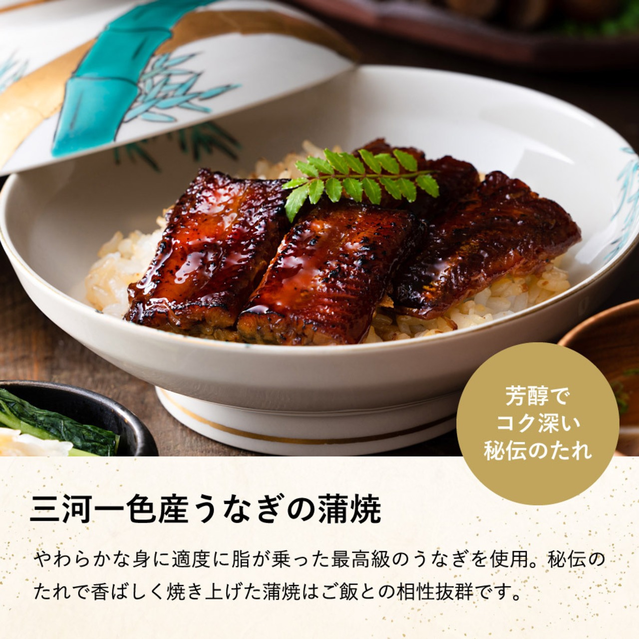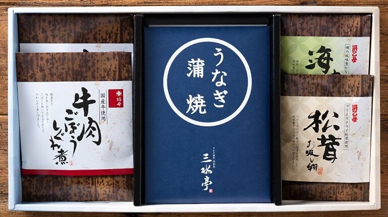 ●内容量:三水亭 三河一色産うなぎの蒲焼半身×1、柿安 牛肉ごぼうしぐれ煮50g×2、浜乙女 松茸お吸物(3.4g×2)×1、浜乙女 海苔お吸物(3.6g×2)×1