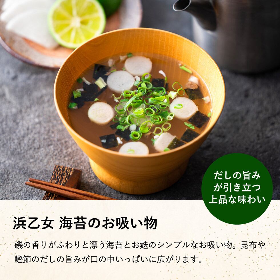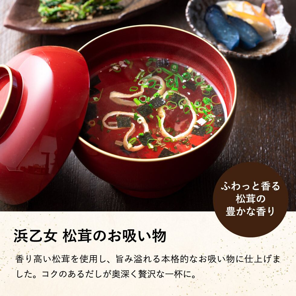 松茸お吸物:調味顆粒(国内製造(食塩、砂糖、鰹節粉末、醤油、椎茸エキス粉末、昆布エキス粉末))、麩、乾燥ねぎ、のり、味付松茸/調味料(アミノ酸等)、香料、酸化防止剤(V.E)、(一部に小麦・大豆・まつたけを含む) 海苔お吸物:調味顆粒(国内製造(食塩、砂糖、醤油、鰹節エキス粉末、昆布エキス粉末、椎茸エキス粉末、蛋白加水分解物))、麩、のり、乾燥ねぎ/調味料(アミノ酸等)、膨脹剤、(一部に小麦・大豆を含む)
