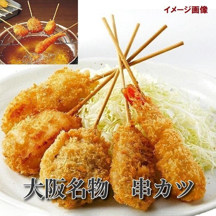 【多彩なラインナップ】: 本商品には、大阪名物の味わいを凝縮した5種の串カツが含まれています。豚ロース,牛,鶏ムネ,エビ,椎茸などの食材を使用した串カツは、美味しさが際立ち、食卓を華やかに彩ります!