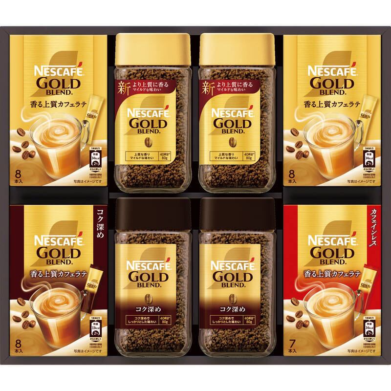 【内容】 ゴールドブレンドインスタント・コク深めインスタント各80g×各2、スティックコーヒー(7g×8P)×2、コク深めスティック(7g×8P)・カフェインレススティック(7g×7P)×各1