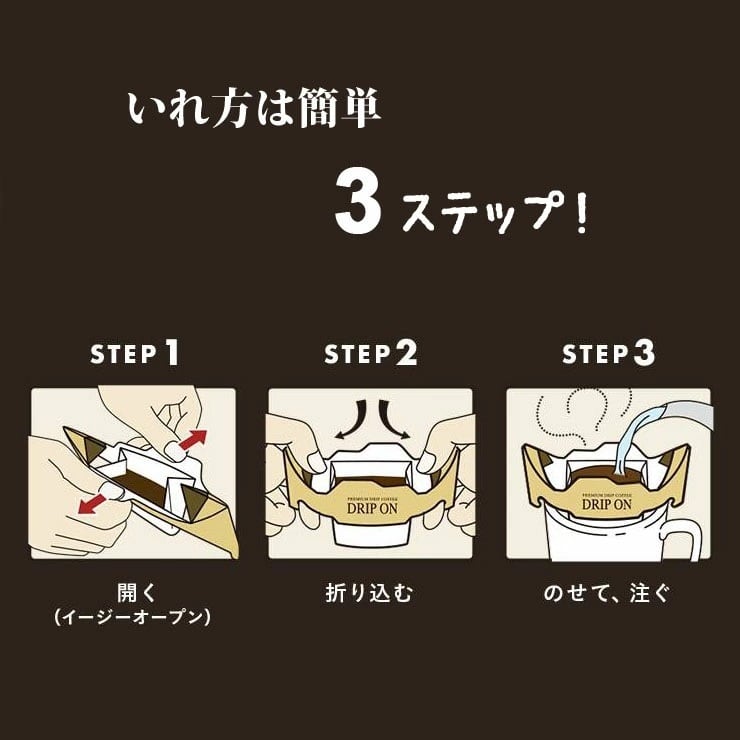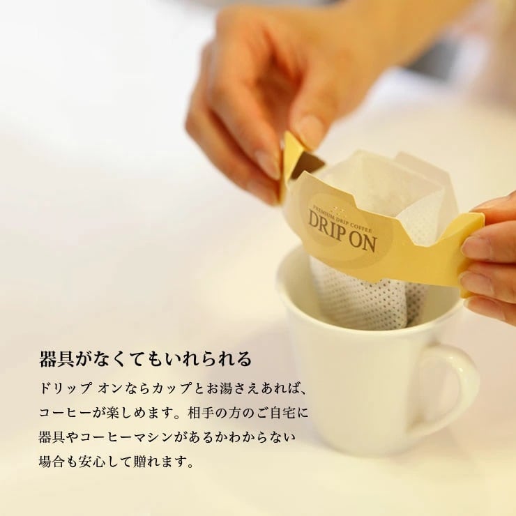 ●ドリップオンタイプのコーヒーは、手軽に本格的なコーヒーを楽しめる点が特長です。お湯を注ぐだけで、挽きたての香りを手軽に堪能できますので、忙しい毎日にもぴったりです。