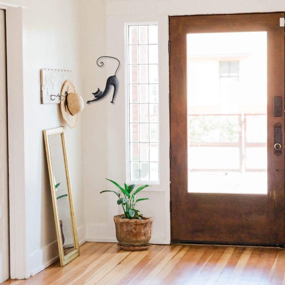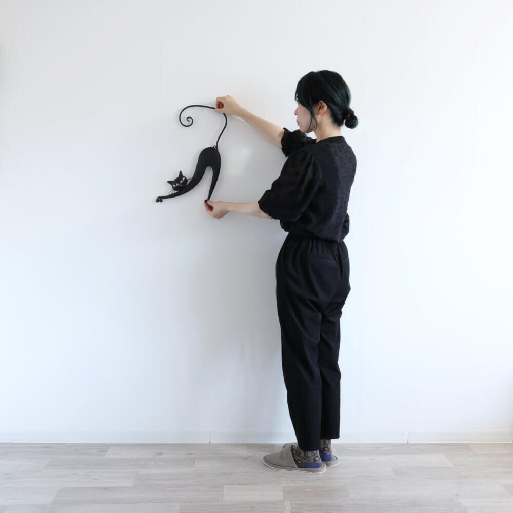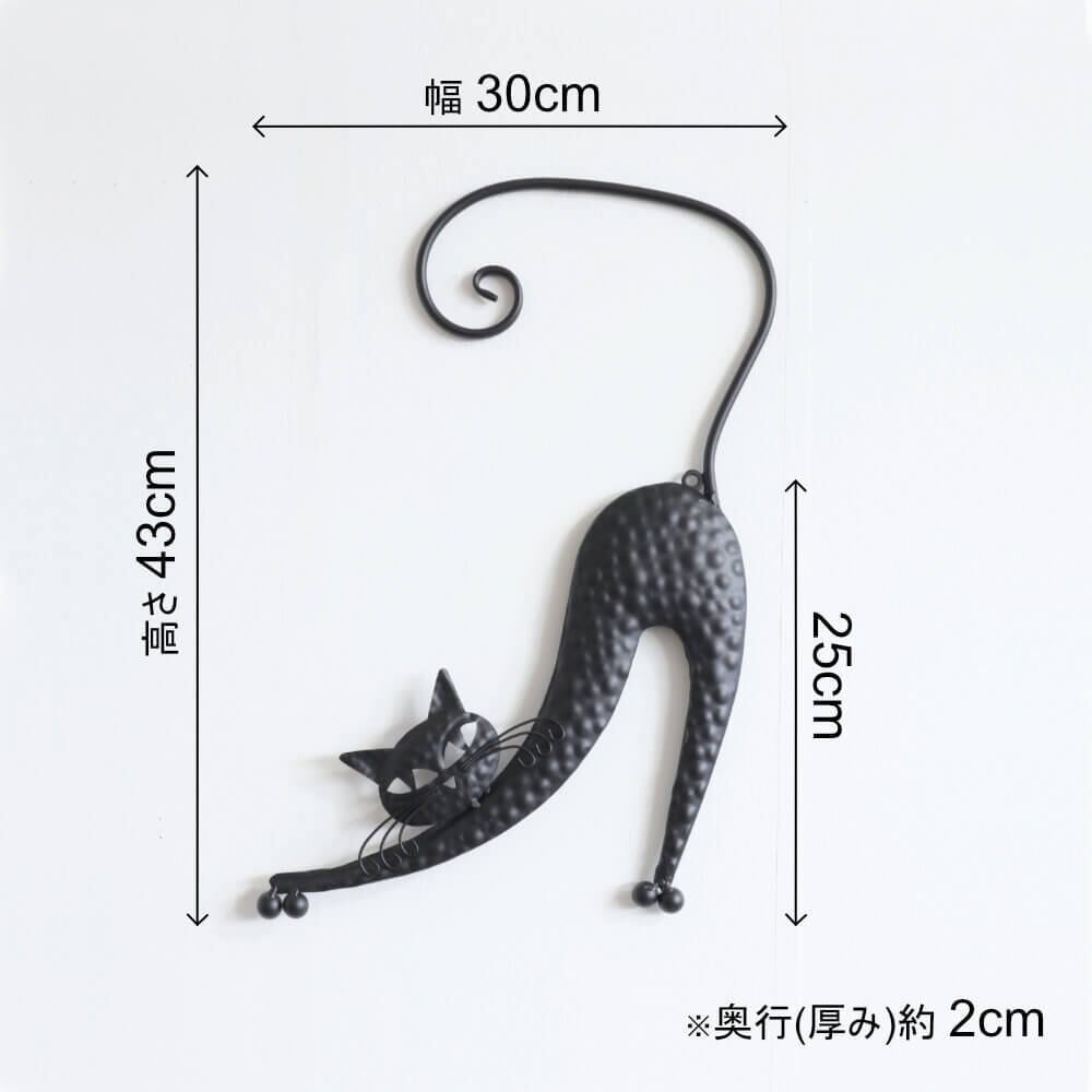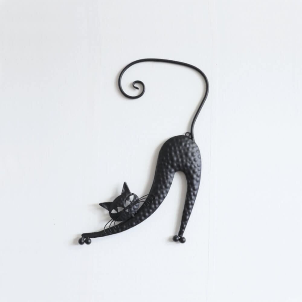 リラックスした表情で伸びをするネコのウォールアクセント。お部屋にほんのり癒しと楽しさをプラスしてくれる、個性的な壁掛けアイテムです。手作りの温かみを感じられるデザインで、お部屋のインテリアにアクセントを加えます。