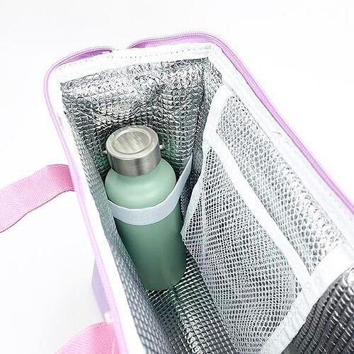 このランチバッグは、内側に保冷・保温効果のある素材を使用しており、食材の温度をしっかりとキープします。独自の構造により、大きく開いて収納もスムーズ。さらに、内側にはメッシュポケットがあり、小物の整理も楽々です。ペットボトルを固定するゴム付き,背面ボタンポケットも完備しており、便利さが際立ちます!