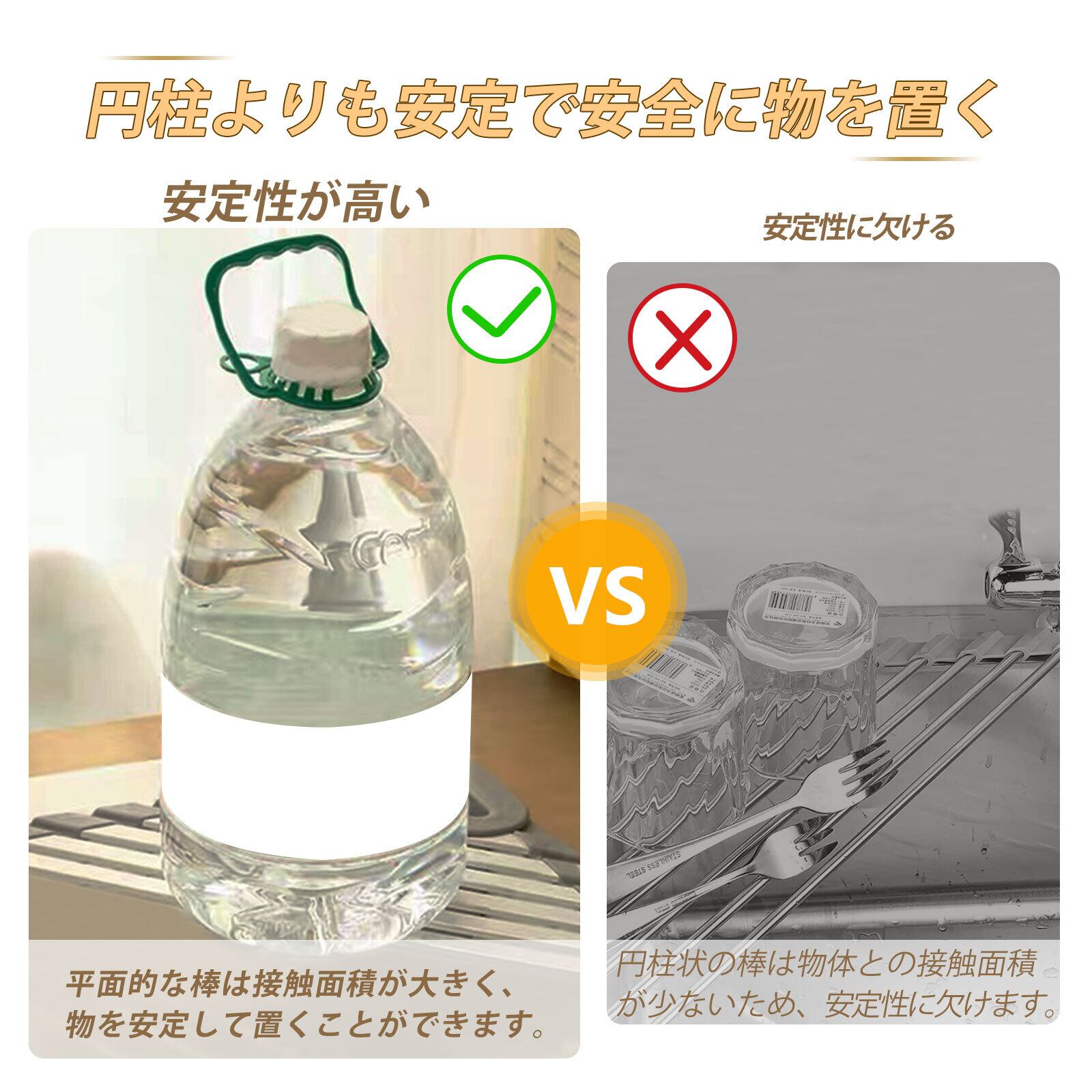 【フラットバーVS円柱バー】円柱バーよりも安定して物を置くことができます。円柱状の棒は物体との接触面積が少ないため、安定性に欠けます。ママ倉の平面的な棒は接触面積が広く、物を安定して置くことができるため、安定性が高いです。