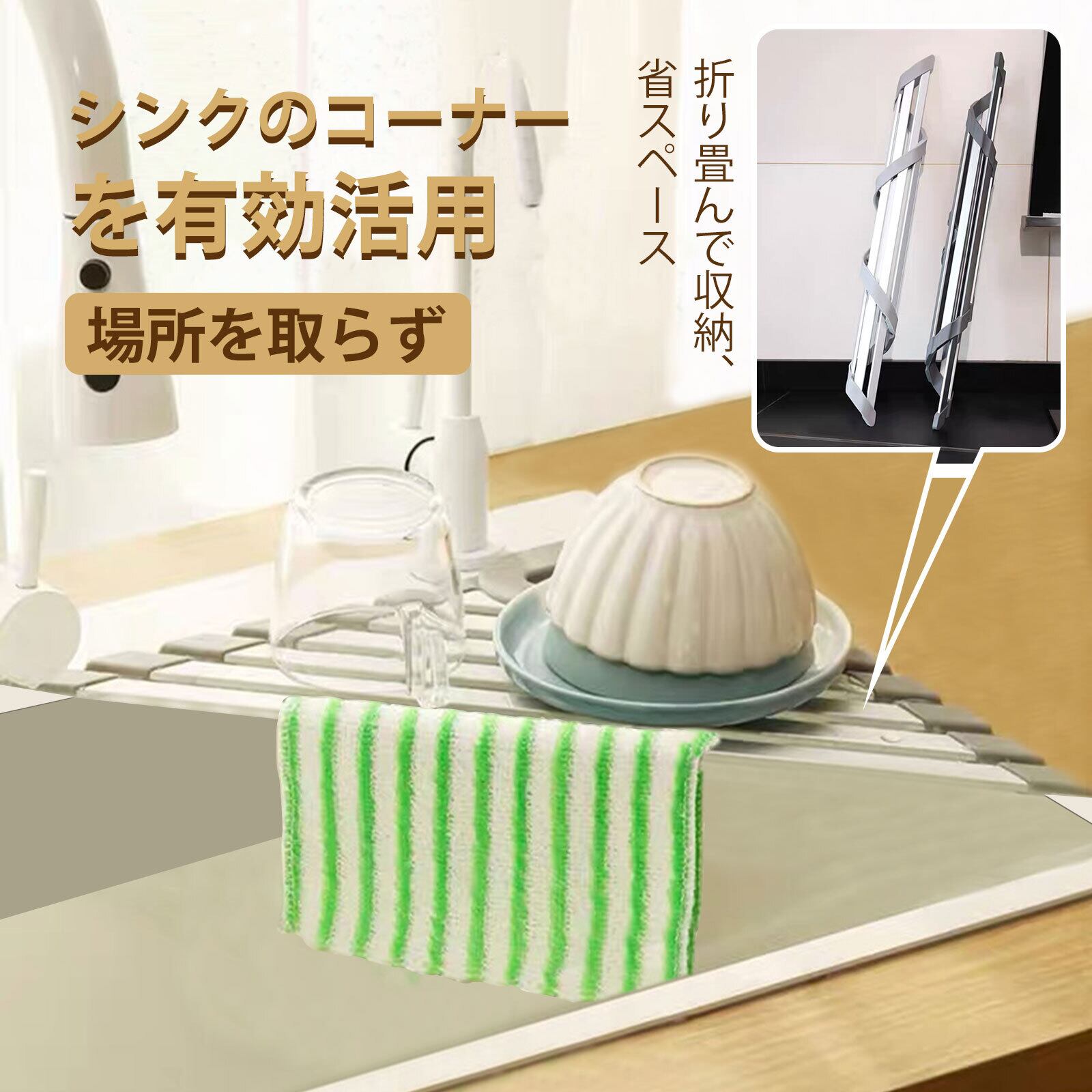 【詳細】シンクのコーナーのスペースを効果的に活用できる三角形の水切りラックです。場所を取りません。折り畳み可能で収納しやすく、スペースを節約できます。シリコンエッジで滑り止め、カット可能。アルミニウム合金の棒で軽量、耐摩耗性があります。シリコンとアルミニウム合金の棒は取り外して洗浄できるので、汚れが隠れることがありません。防錆、耐腐食。